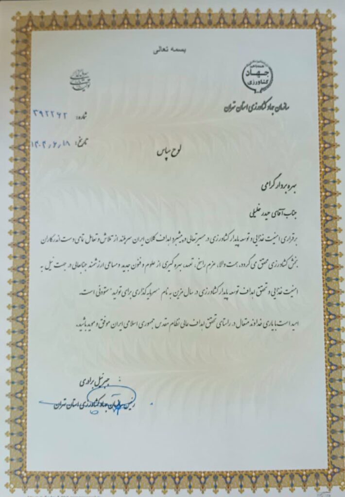 در این دیدار تندیس و لوح سپاسی از طرف رئیس سازمان جهاد کشاورزی استان تهران به حیدر خلیلی اهداء شد.